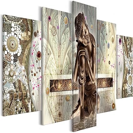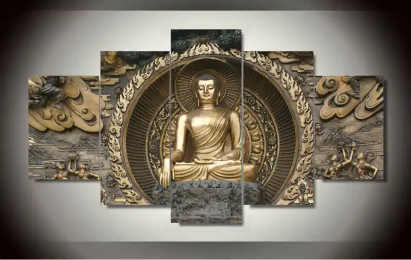 Sul quadro buddha s philosophy 5 parts golden wide l artista ha raffigurato elementi come oriente zen luce buddha oraz buddismo.
