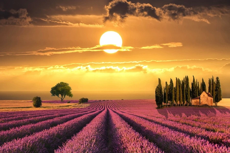 Paesaggio Mozzafiato Con Campo Di Lavanda Allalba Dipinti Da Parete Quadri Cielo Drammatico Vibrante Colore Coltivato Myloview It
