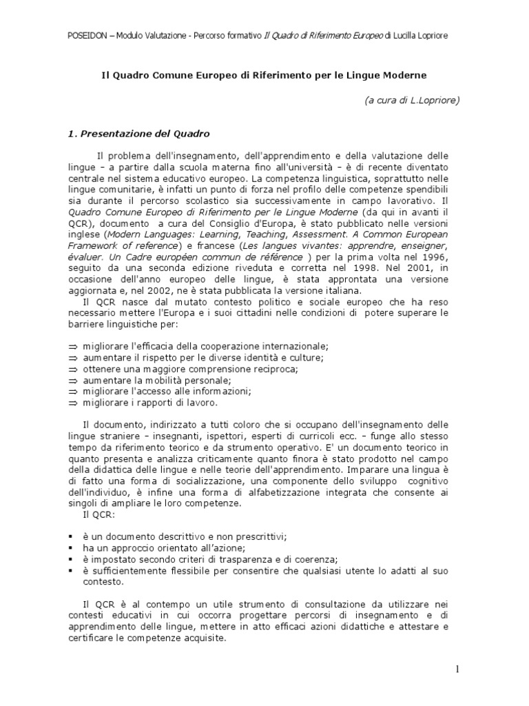 Il Quadro Comune Europeo Di Riferimento E La Sua Valenza Formativa 1 Pdf Free Download