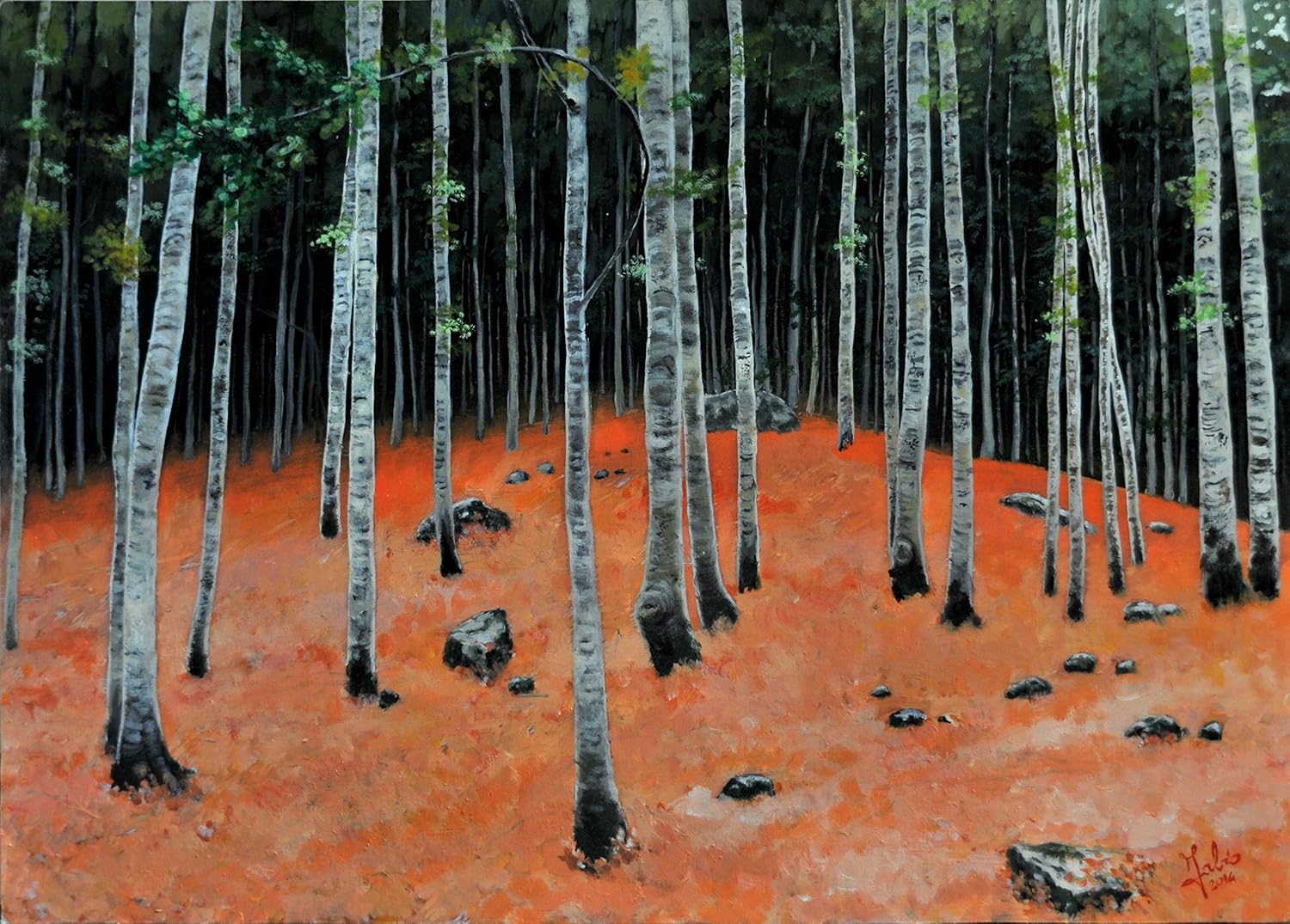 Ritmi Verticali Dipinto Quadro Acrilico Con Bosco Di Faggi Su Terreno Coperto Di Foglie Secche Ed Alberi Con Foglie Verdi Primaverili 50x70 Amazon It Handmade