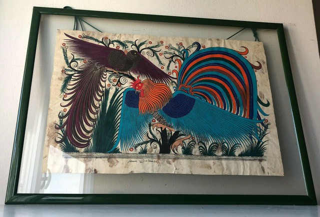 Quadro Dipinto Du Pergamena Un Gallo E Un Pavone Juan Damaso Messico Ebay