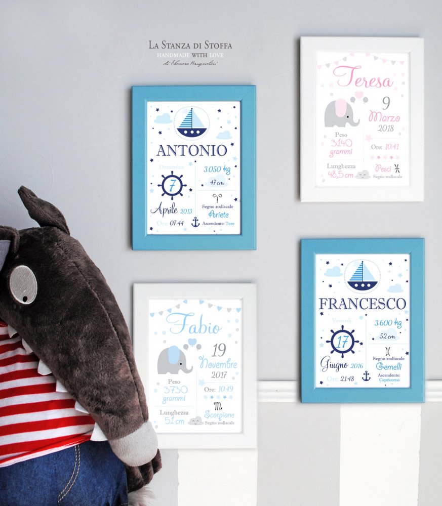 Quadro nascita. Cosa si ottiene una volta effettuato l acquisto lavoreremo per te e riceverai file digitali questa offerta fa riferimento ad una grafica digitale fornita sotto forma di file elettronico non verra spedito nessun articolo già stampato. Visualizza altre idee su nascita quadretti immagini. Fiocchi e quadretti nascita ghirlande bimbo a bordo coordinati nascita banner per la cameretta e creazioni personalizzate per la nascita del tuo bebè. Quadretto nascita sogni d oro elefantico con stella personalizzabile quadretto nascita è un idea regalo perfetta per un baby shower per celebrare la nascita di un bambino o per decorare la cameretta con colori pastello.