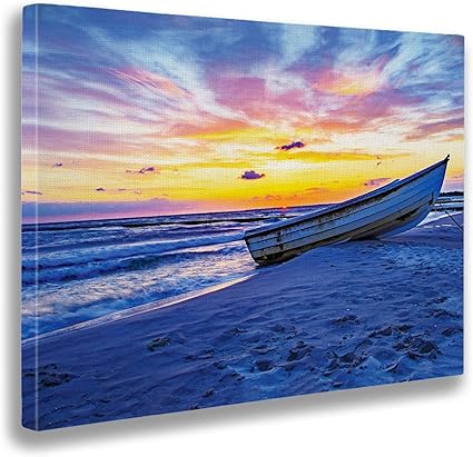 Giallobus Quadro Gia Intelaiato Pronto Da Appendere Stampa Su Tela Canvas Tramonto Con Barca In Riva