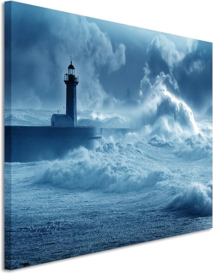 Colore Blu Petrolio Sinus Art Ottima Qualita Faro Nella Tempesta Del Portogallo Quadro Da Parete 120 X 80 Cm Tela Su Telaio Decorazioni Per Interni Arte