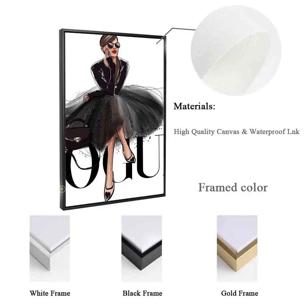 Quadro vogue preto e branco disponível em diversos tamanhos com as opções de moldura branco fosco ou preto fosco.