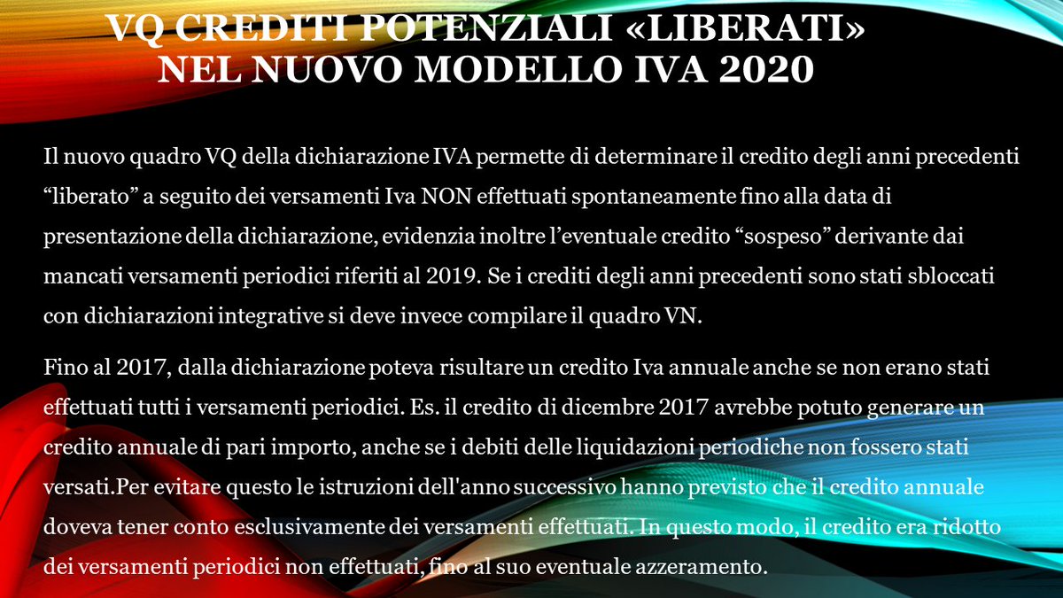40 delle istruzioni ministeriali. Debutta il quadro vq al fine di accogliere i crediti iva maturati per via di versamenti periodici non spontanei è stato previsto un nuovo quadro nel modello di dichiarazione. Venendo alla principale novità del modello iva 2020 la funzione del quadro vq in buona sostanza è di evidenziare l esistenza di crediti potenziali che non possono emergere nella sede. Una delle principali novità del modello è il quadro vq previsto per consentire ai contribuenti interessati di determinare il credito maturato a seguito di versamenti di iva periodica non spontanei.