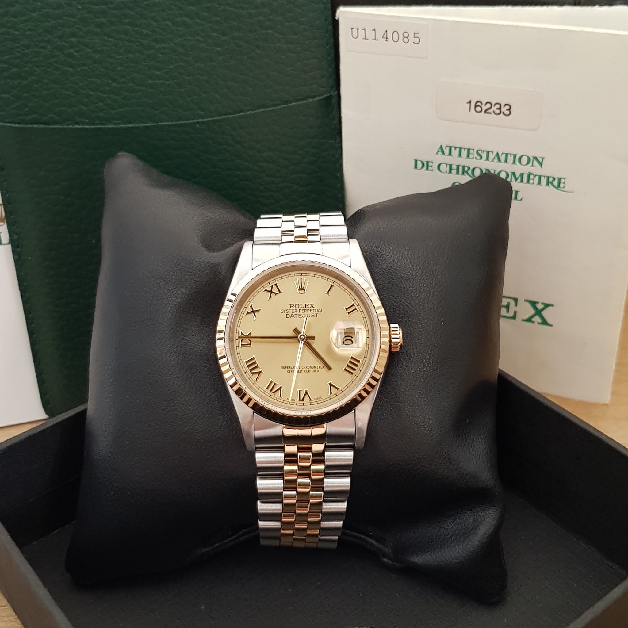 Jual Beli Tukar Tambah Service Jam Tangan Mewah Arloji Original Buy Sell Trade In Service Sold Rolex Datejust Two Tone Ref 16233 Champagne Roman Numerals Dial Automatic Jubille Bracelet 36mm U Series Year 16233 Watch