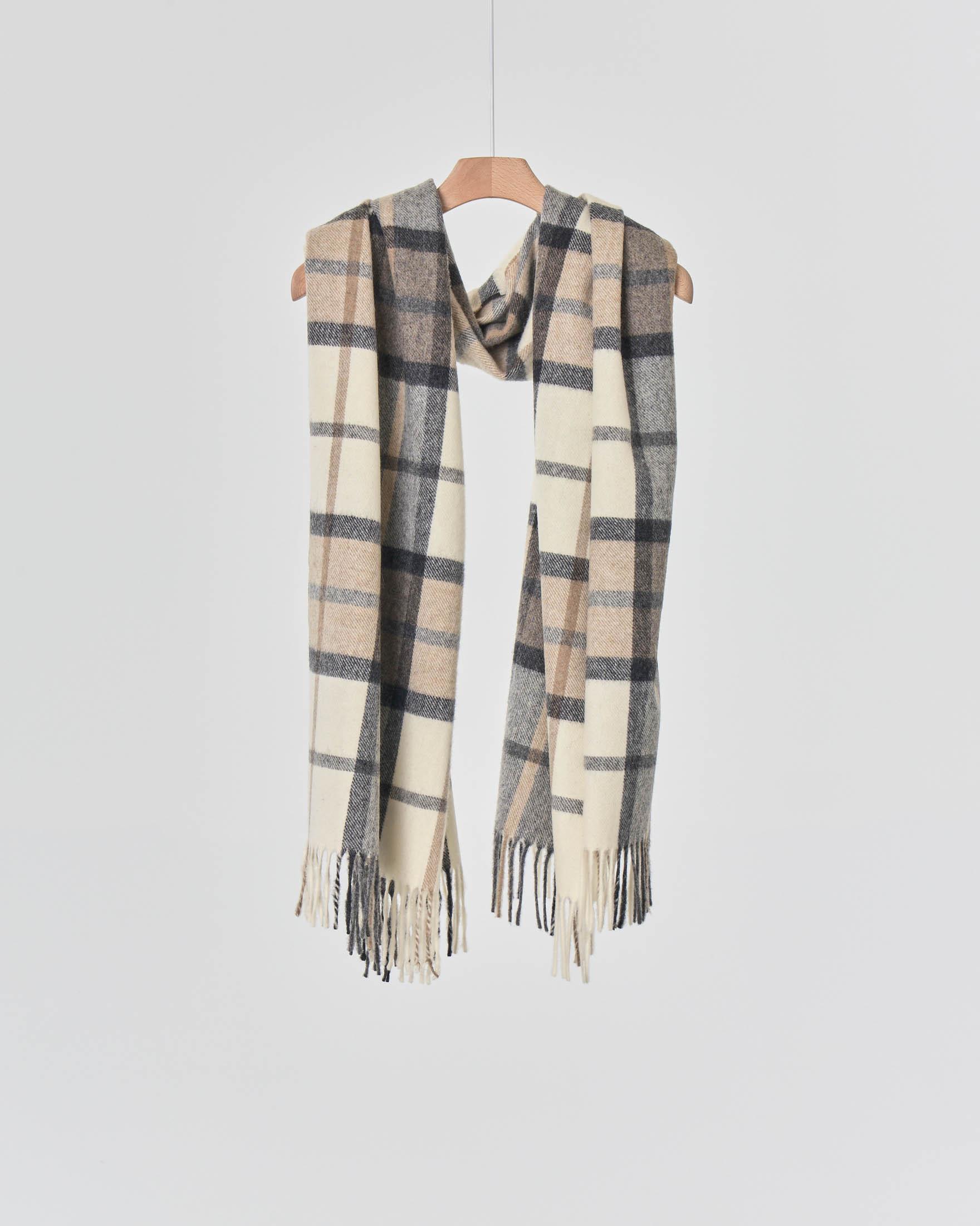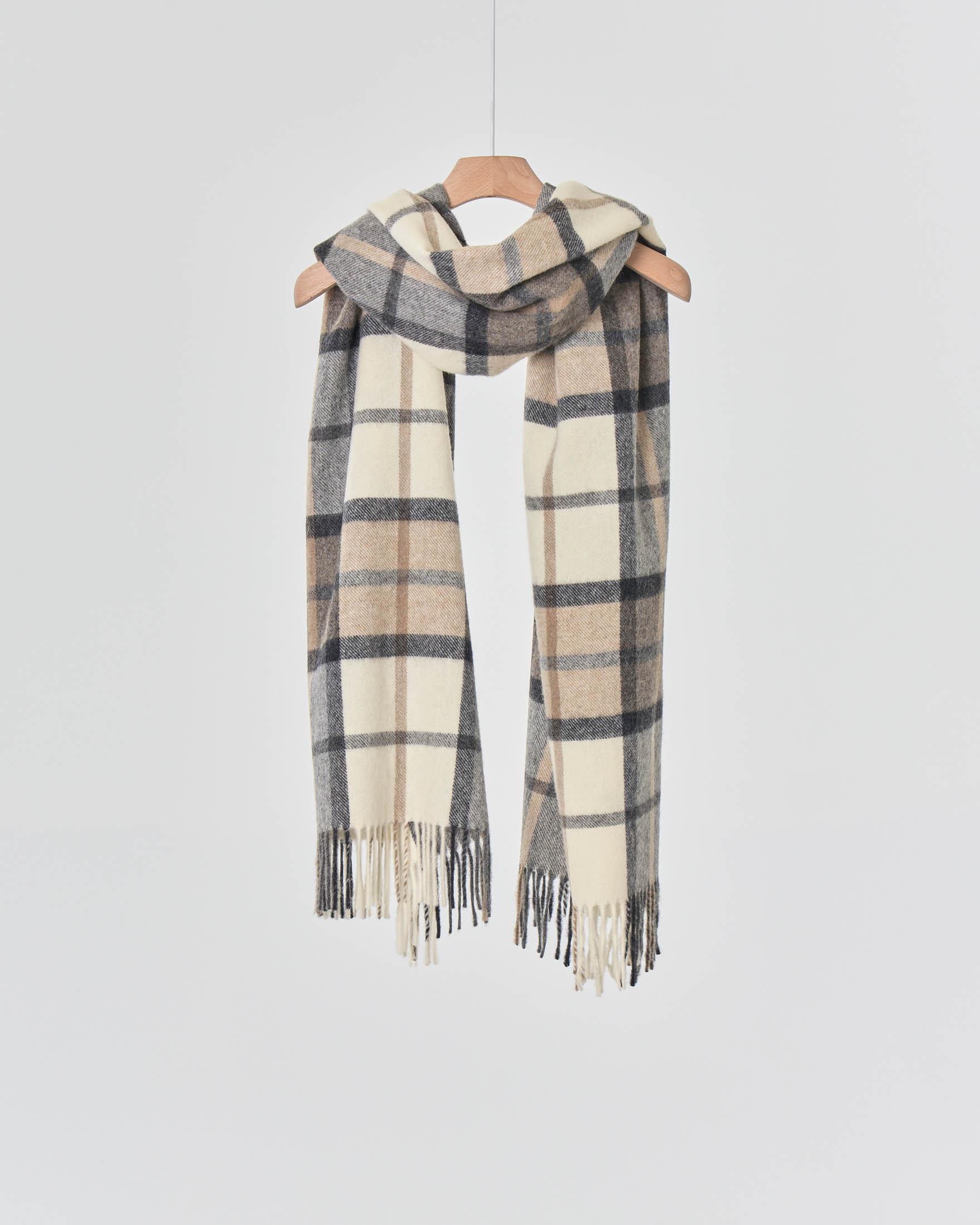 Sciarpa In Lana Color Avorio A Fantasia A Quadri Check Grigi E Beige Con Frange Al Fondo Pellizzari E Commerce