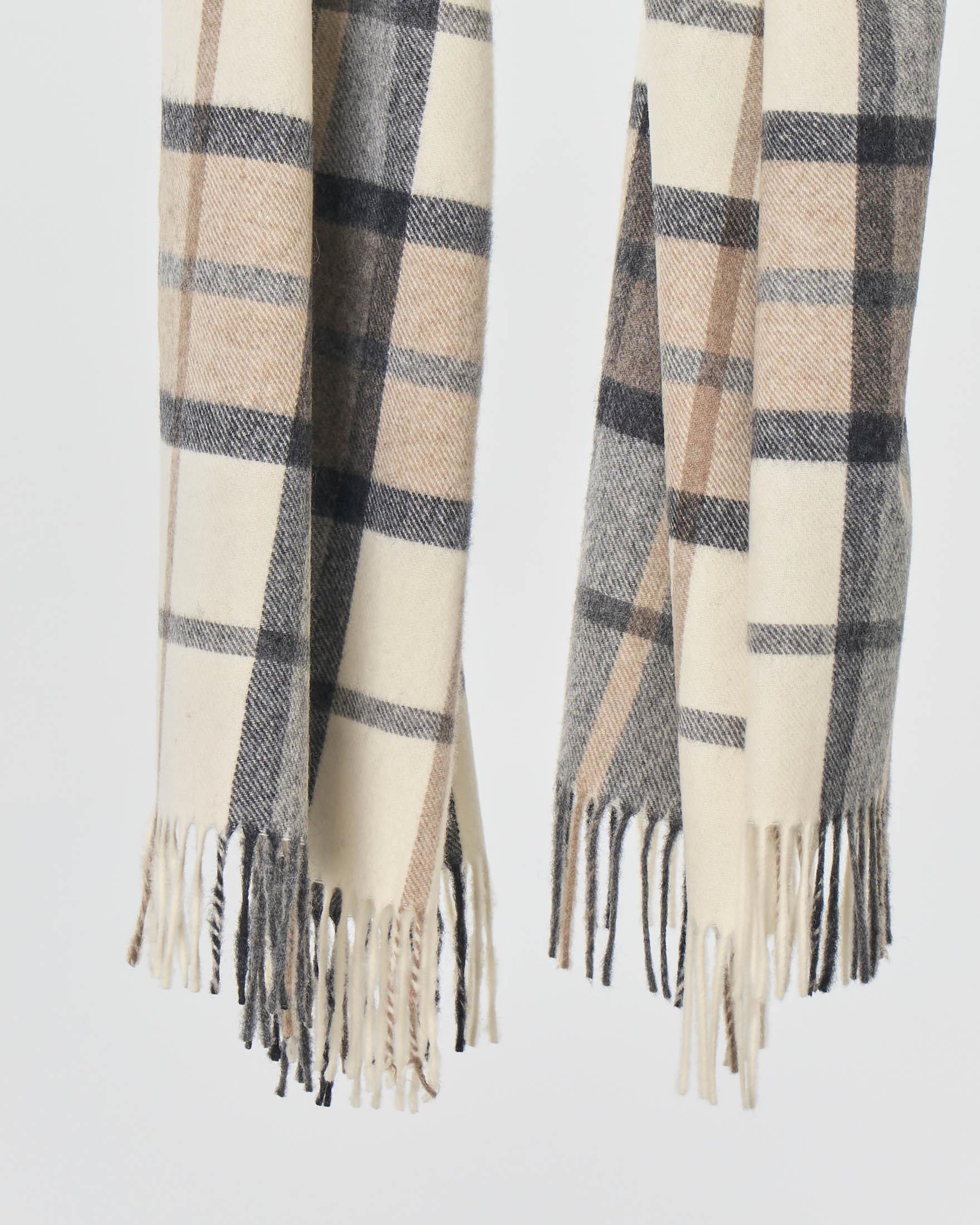 Sciarpa In Lana Grigia A Fantasia Scozzese Bianca E Beige Con Frange Al Fondo Pellizzari E Commerce