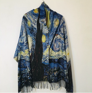Sciarpa Stola Sfrangiata Disegno Notte Stellata Van Gogh Multicolore Colore Interno Blu Lana E Viscosa Dimensioni 180x74 Cm Cindystylist