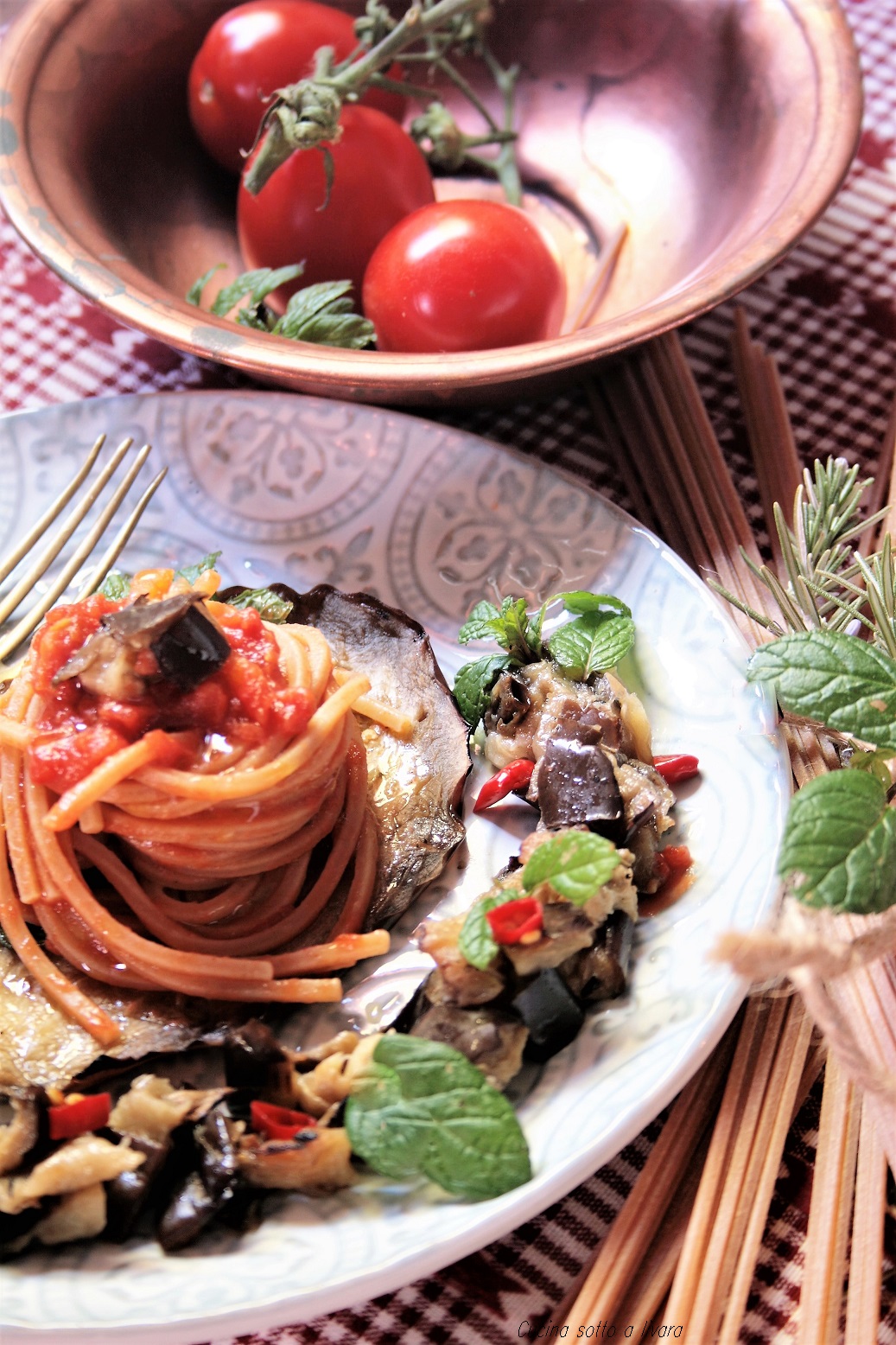 Spaghetti Integrali Con Salsa Al Pomodoro E Melanzane Alla Menta Cucina Sotto A Livara