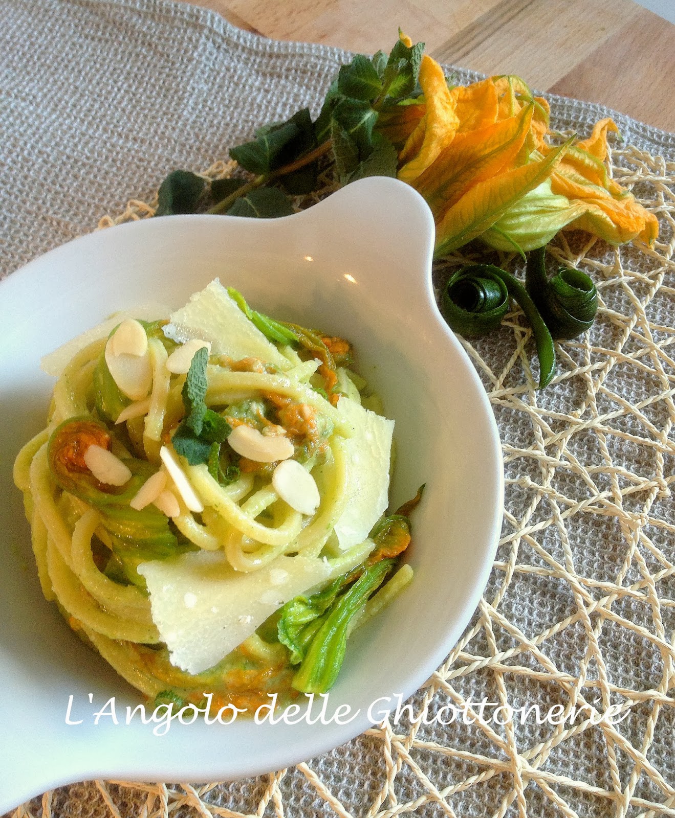 Spaghetto Quadrato Con Fiori Di Zucca Pesto Di Zucchine Menta E Lime Ricetta E Cucina