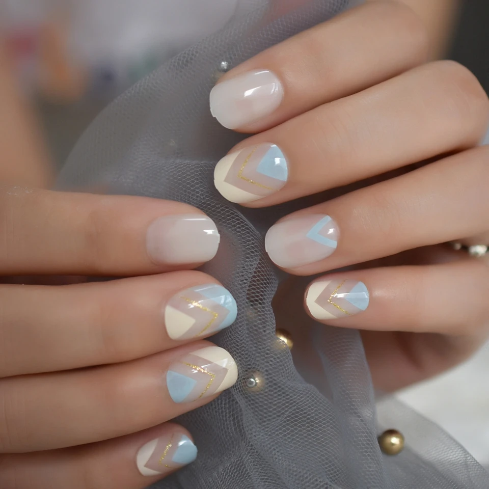 Breve Modello Faux Ongles A Testa Tonda Bianco Latte Trasparente Unghie Finte Per Tutti I Giorni Di Triangoli Blu Unghie Con L Autoadesivo Della Colla Di 24 Unghie Finte Aliexpress