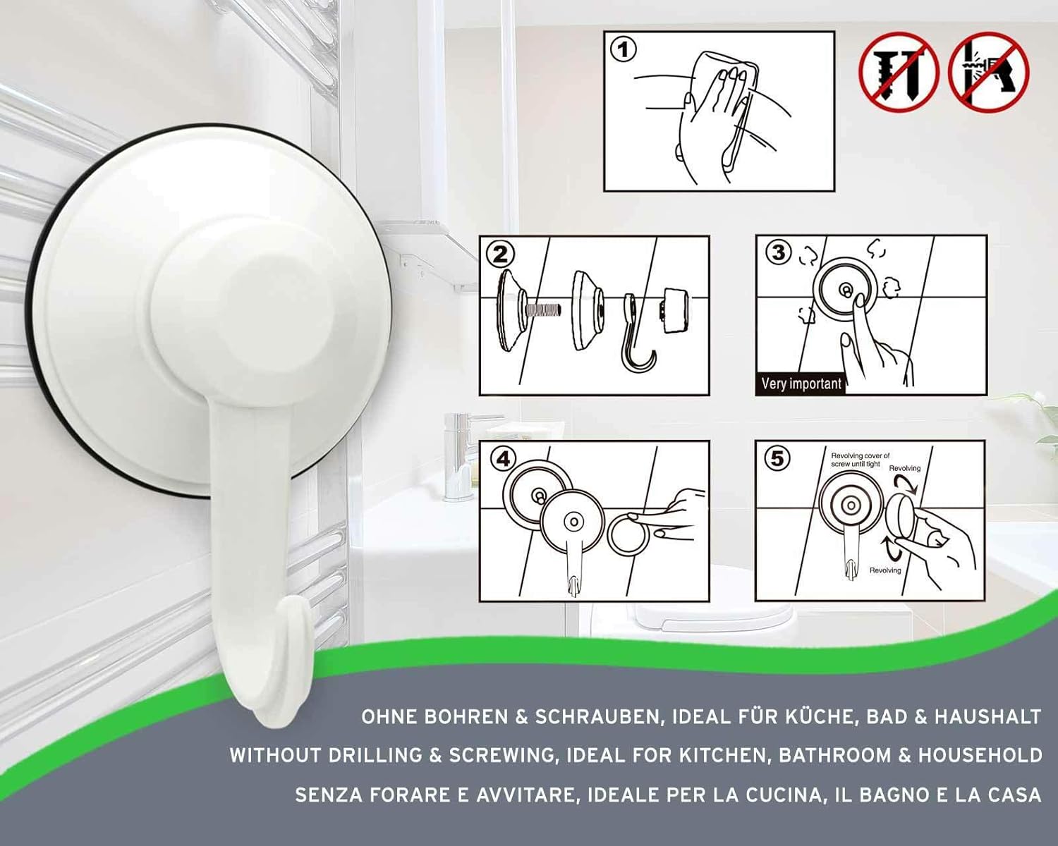 Bianco Set Di 2 Pezzi Da Pingenaneer Capacita Di Carico 2 Kg Senza Trapano Gancio A Ventosa Per Bagno E Cucina Plastica Per Vetro Piastrelle Di Ceramica Ganci Portasciugamani